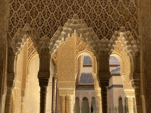 Erna lopen we naar de ommuurde tuin, een waar hoogtepunt van Nasridische architectuur. Uniek is de facade en het fijne stucwerk dat samen met de vier waterlopen in de patio de hemelse tuin van de islam verbeeldt. In het midden staat de leeuwenfontein voorzien van twaalf leeuwen die staan voor de twaalf zonnen van de dierenriem. De rand van schaal is weer versierd met verzen van dichter Ibn Zara. We staan stil bij de bijzondere details en betekenis van deze ruimte. Deze patio wordt omringd door vier zalen die een eenheid vormen met de patio.